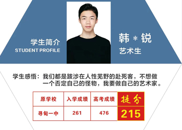 黑(hēi)馬優秀學子(zǐ):韓*銳 原尋≥₩≈甸一(yī)中 藝術(shù)生(shēng),入學成績:261,2022年(€φ$φnián)高(gāo)考成績476,提高₹™∑(gāo)215。...