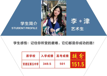 黑(hēi)馬優秀學子(zǐ):李*津 原♥£Ω學校(xiào)-官渡區(qū)第五中學 藝術(shù)生(shēngγ&),入學成績:349.5,2022年(nián)高<<(gāo)考成績:501,提...