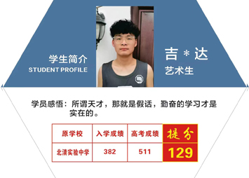 黑(hēi)馬優秀學子(zǐ):吉*達 原學校(xiào♠ ©)-北(běi)清實驗中學 藝術(shù)生(shēng),入δ♥學成績:382,2022高(gāo)考成績:511,提高(gāo§¥)...