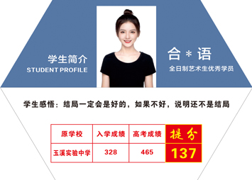 黑(hēi)馬優秀學子(zǐ):合*語 原學校(xiào)-玉溪實驗中學↔≤ 藝術(shù)生(shēng),入學成λ>♣₩績:328,2022高(gāo)考成績:465,提高(gāo)..&'.